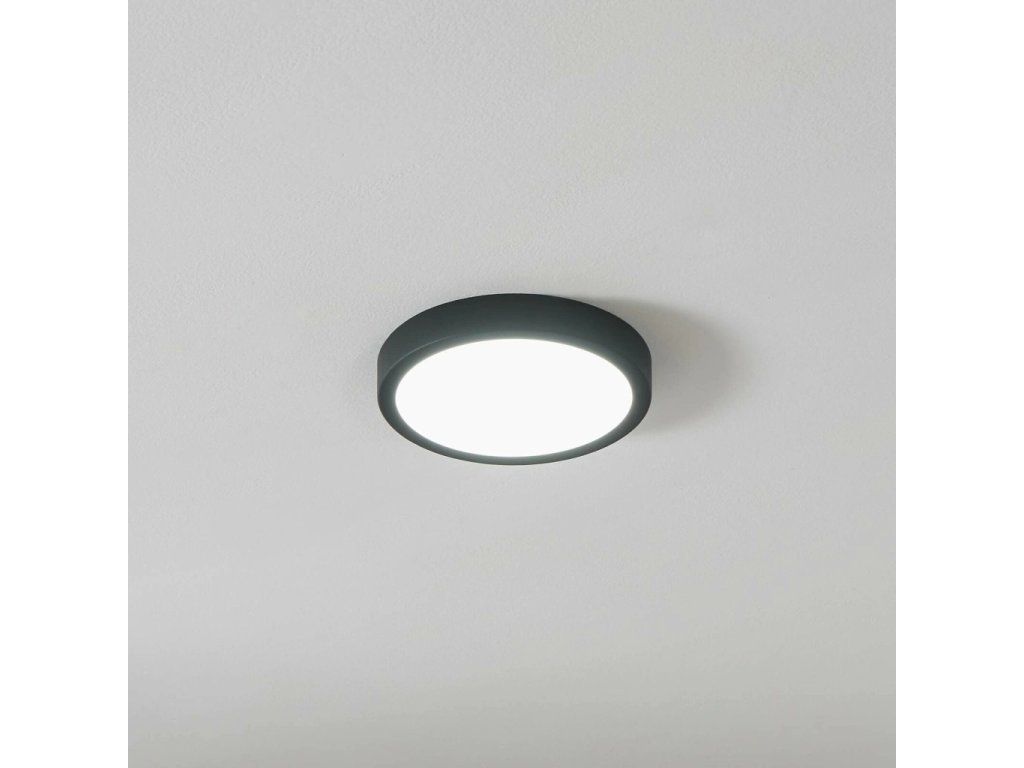 Svítidlo má Ø 210 mm a nízký profil 28 mm, takže zůstane nenápadné i na nižším stropě. Těleso je z černého kovu s bílým plastovým difuzérem; hmotnost 0,45 kg zjednodušuje montáž a manipulaci.