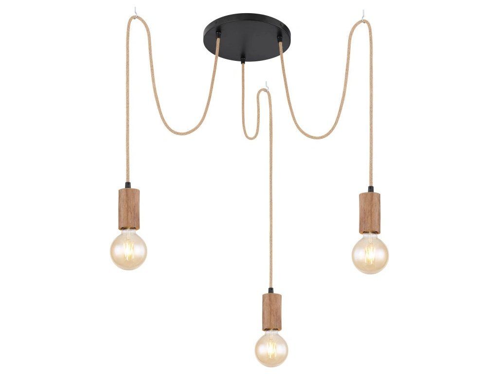 - Závěsné svítidlo, kov černý matný, dřevo tmavohnědé, konopné lano hnědé, Ø300, V: 1600, bez žárovek 3xE27, max. 60W 230V