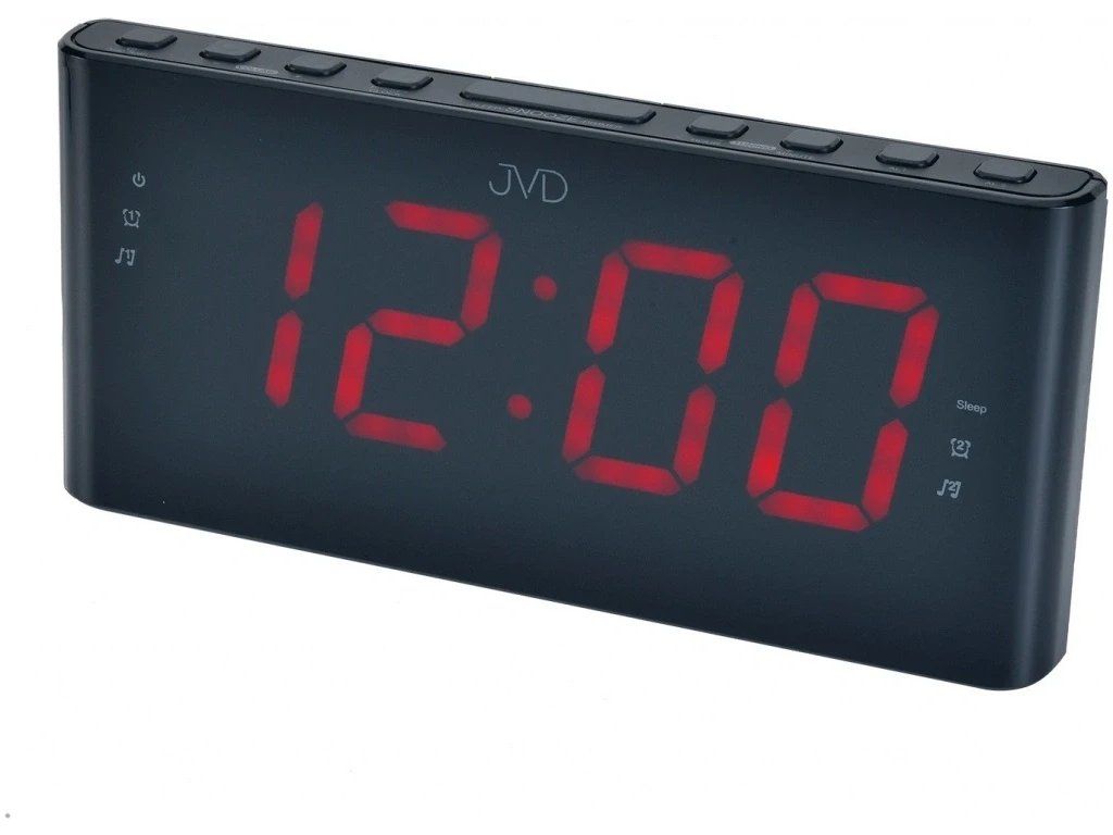 Moderní budík značky JVD do sítě se svítícími číslicemi.