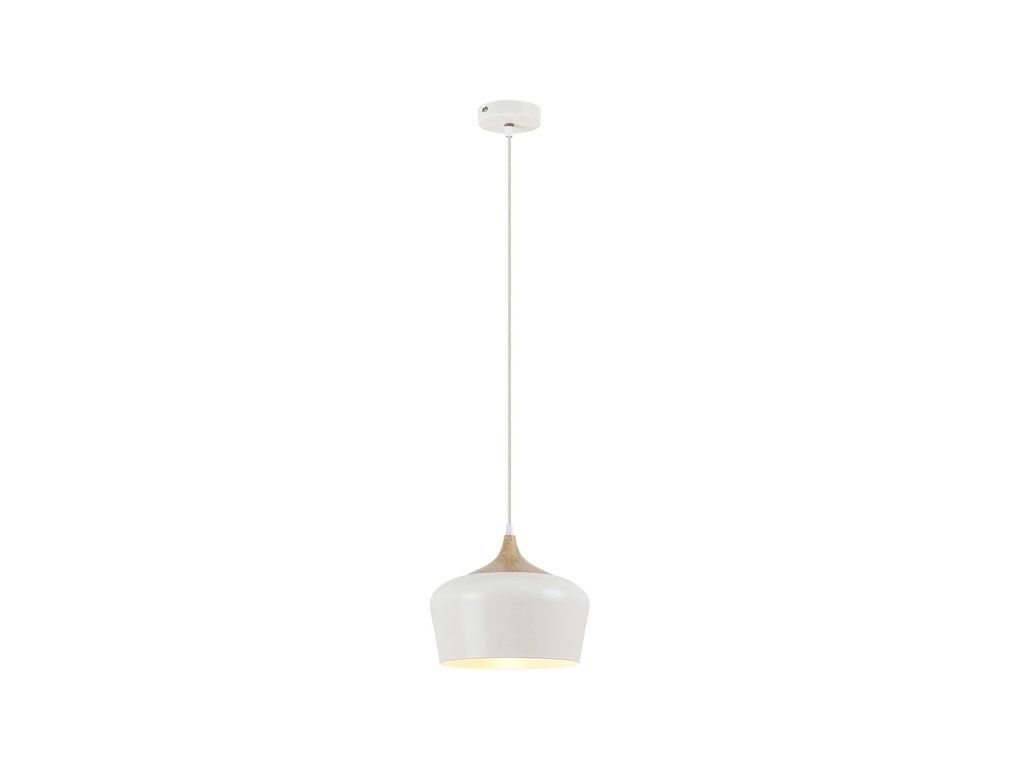 Přívěsek v severském stylu s 1 zásuvkou. Bílá kovová konstrukce s odstupem 130 cm od stropu a 30 cm průměrem, bílé a bukové stínidlo. Závěs lze použít s energeticky úsporným světelným zdrojem i o výkonu až 60W, objímka typu E27.