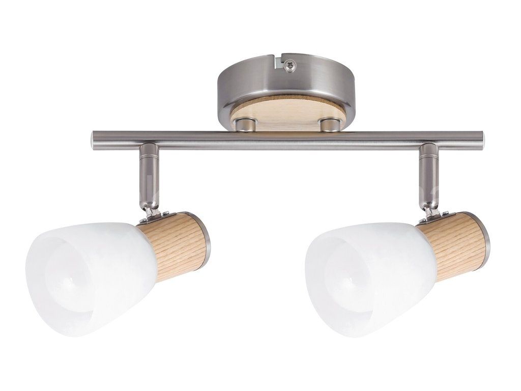 Stropní bodové svítidlo v severském stylu se 2 zásuvkami. 25,5 cm vysoké svítidlo vyrobené z kovu v barvě chromu a dřeva v barvě buku s polohovatelnými bílými stínidly. Svítidlo lze použít se 2 energeticky úspornými světelnými zdroji i s výkonem až 40W každý, zásuvka typu E14.
