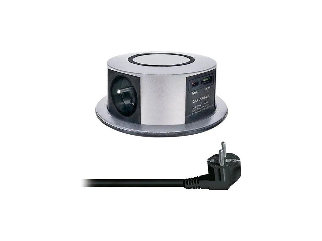Tento výsuvný blok zásuvek přináší vše potřebné pro moderní pracovní plochu. Tři síťové zásuvky 230V, USB-A a USB-C porty s rychlým nabíjením a integrovaná bezdrátová nabíječka s výkonem až 10 W tvoří kompaktní řešení pro každodenní používání. Stříbrné provedení vrchního krytu elegantně zapadne do pracovního stolu, kuchyňské linky nebo konferenční místnosti.