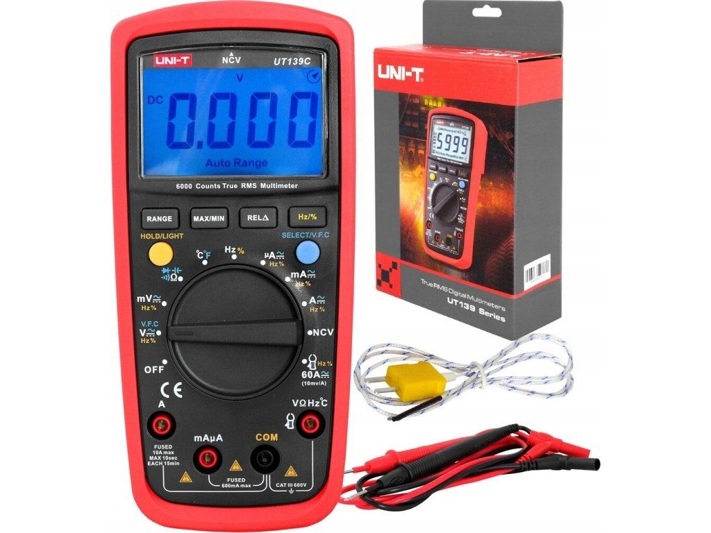 UNI‑T UT-139C nabízí auto‑rozsah, Data Hold, zobrazení min/max, REL, test diod, spojitosti a NCV, měření kapacity, frekvence a teploty sondou typu K. Podsvícený displej usnadní čtení hodnot i v horších světelných podmínkách.